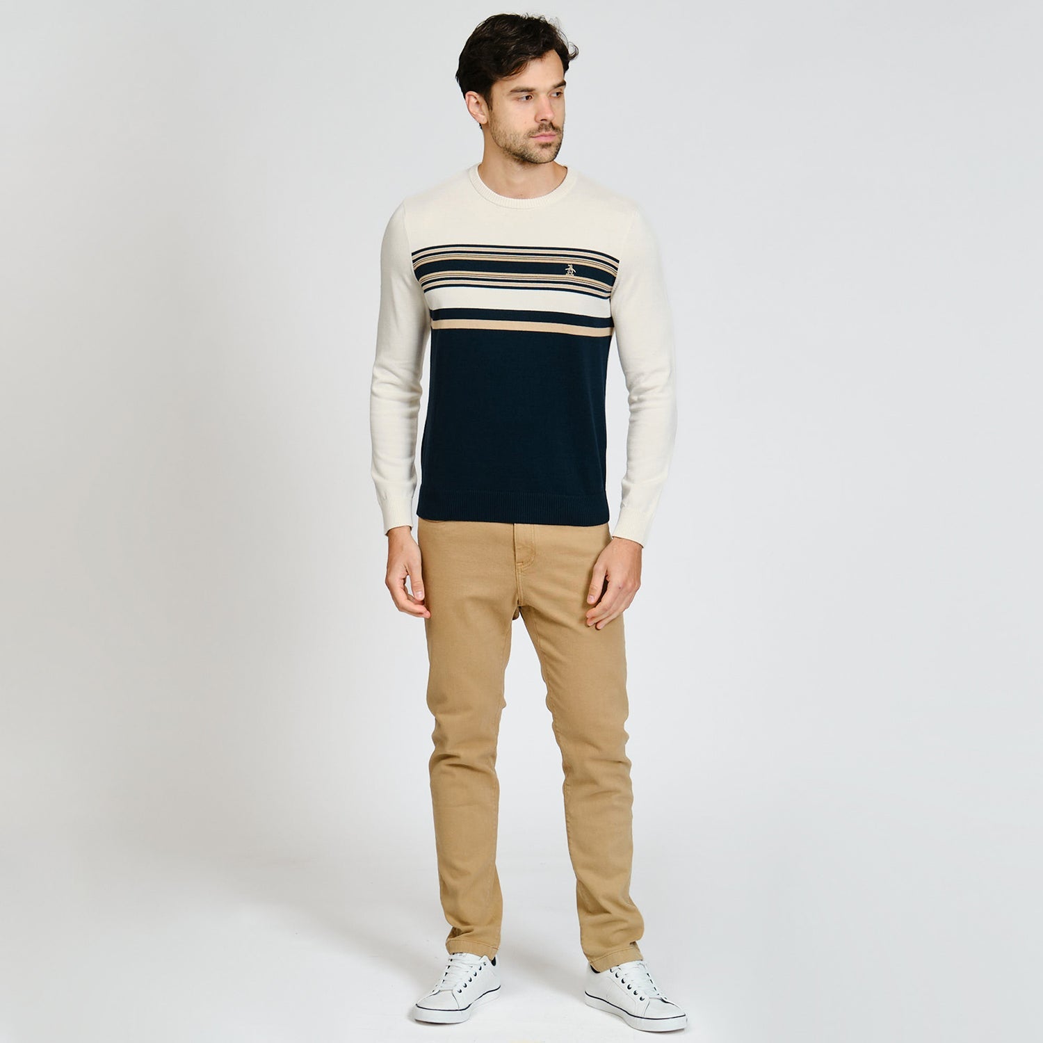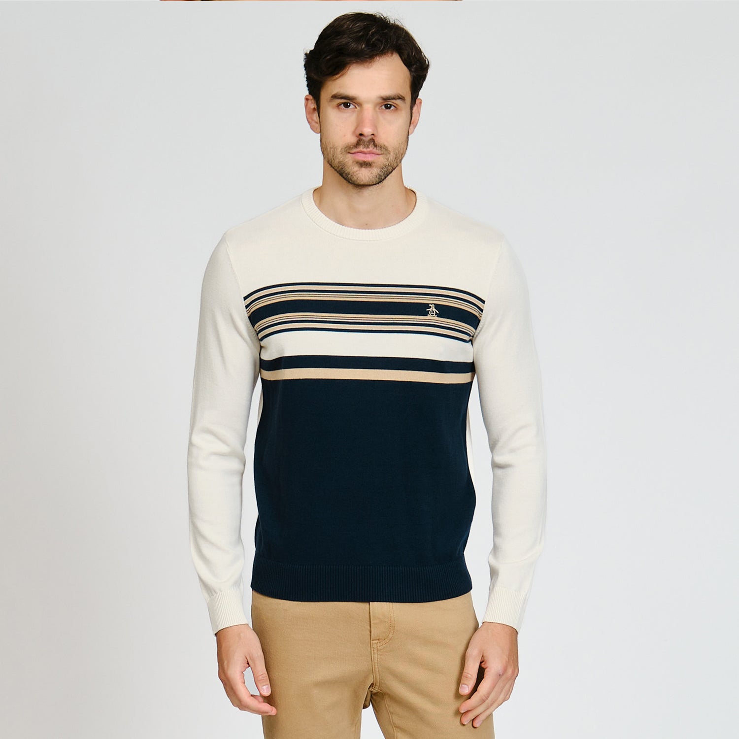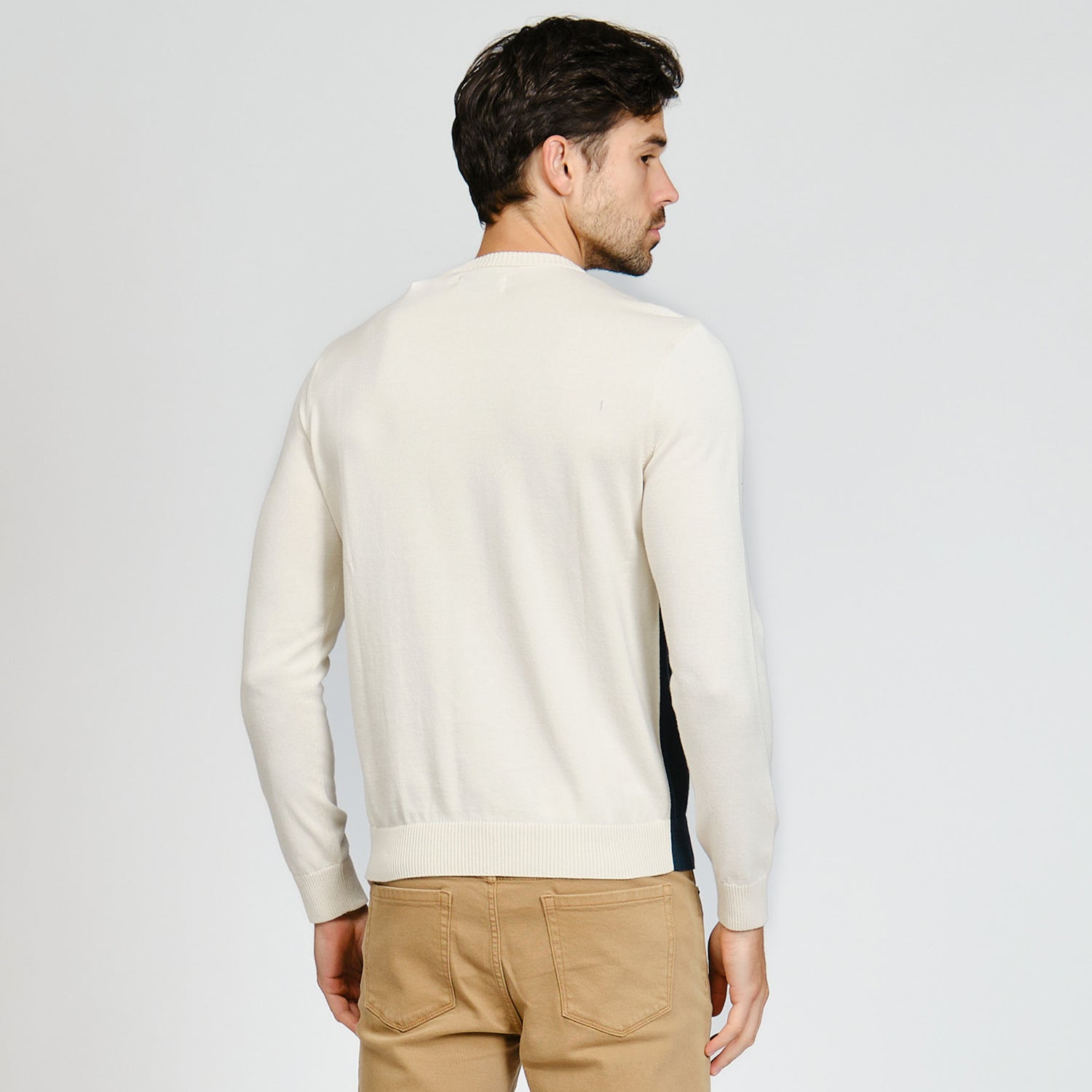 Mantente cómodo y con estilo con esta sueter de algodón con franjas. Perfecta para días frescos y looks relajados.